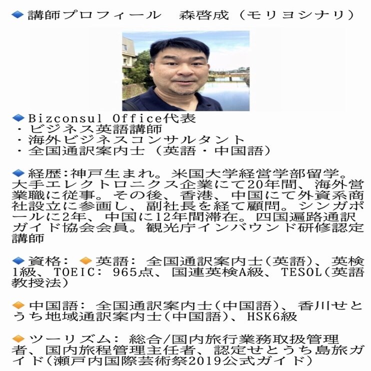 現在、Bizconsul Office代表、海外ビジネスコンサルタント、英語講師、全国通訳案内士(英語・中国語)として活動中。観光庁インバウンド研修認定講師。四国遍路通訳ガイド協会会員。