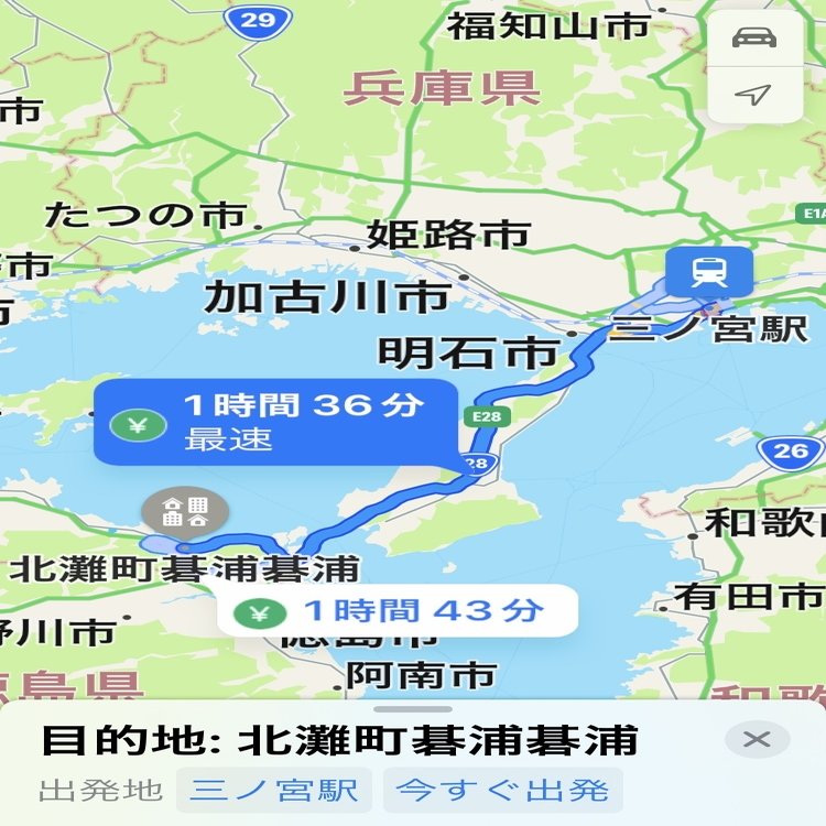 🔹神戸市の三宮駅から鳴門市北灘町碁浦までは車で1時間半くらいの距離にある。