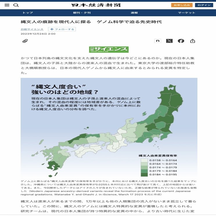 縄文人の痕跡を現代人に探る ゲノム科学で迫る先史時代 – 日本経済新聞記事