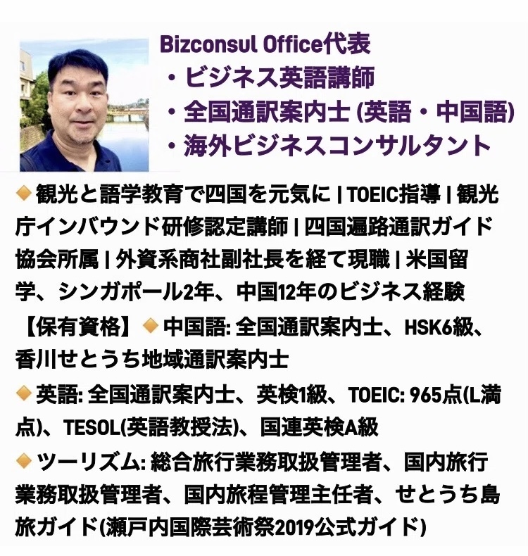 現在、香川県にて地域活性化の一助になればとの想いで海外ビジネスコンサルタント(貿易取引・インバウンド対策)、ビジネス英語講師、全国通訳案内士 (中国語・英語)として活動中。